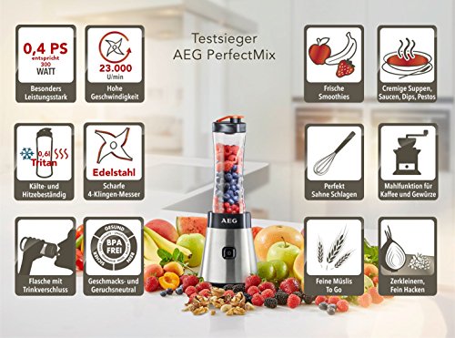 Der AEG PerfectMix SB 2400 Mini Mixer punktet im Mixgerät Test mit einem tollen gebürstetem Edelstahlgehäuse, das in der Küche sehr edel ausschaut. Dieses Gerät gehört zu den günstigsten Modellen auf dem Markt, ohne dass es der Konkurrenz in Sachen Design und Qualität nachsteht. Besonders Sportler wird das Gerät begeistern, da es mit einer 0,6 L Flasche geliefert wird, die man leicht ins Fitnesscenter mitnehmen kann. So kann man sich zuhause ganz einfach seine Power Drinks mixen und sie nach dem Training genießen.